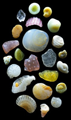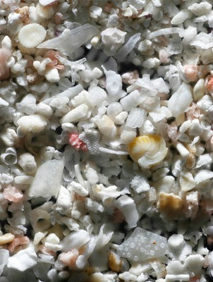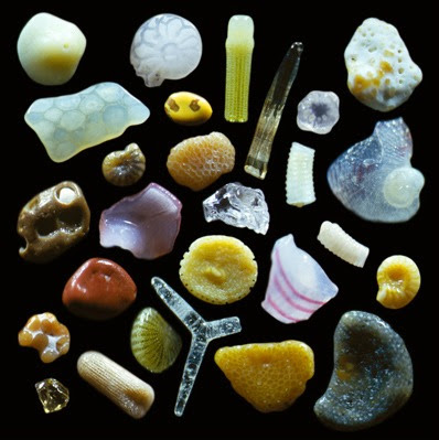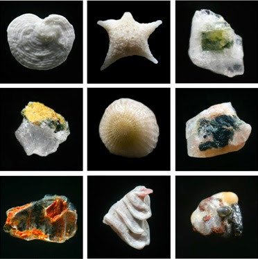 حبيبات رمل من الجزر الإستوائية ويلاحظ وجود كائنات اولية وحيدة الخلية , وبقايا من بعض الكائنات الحية بما فيها قنفذ البحر ..